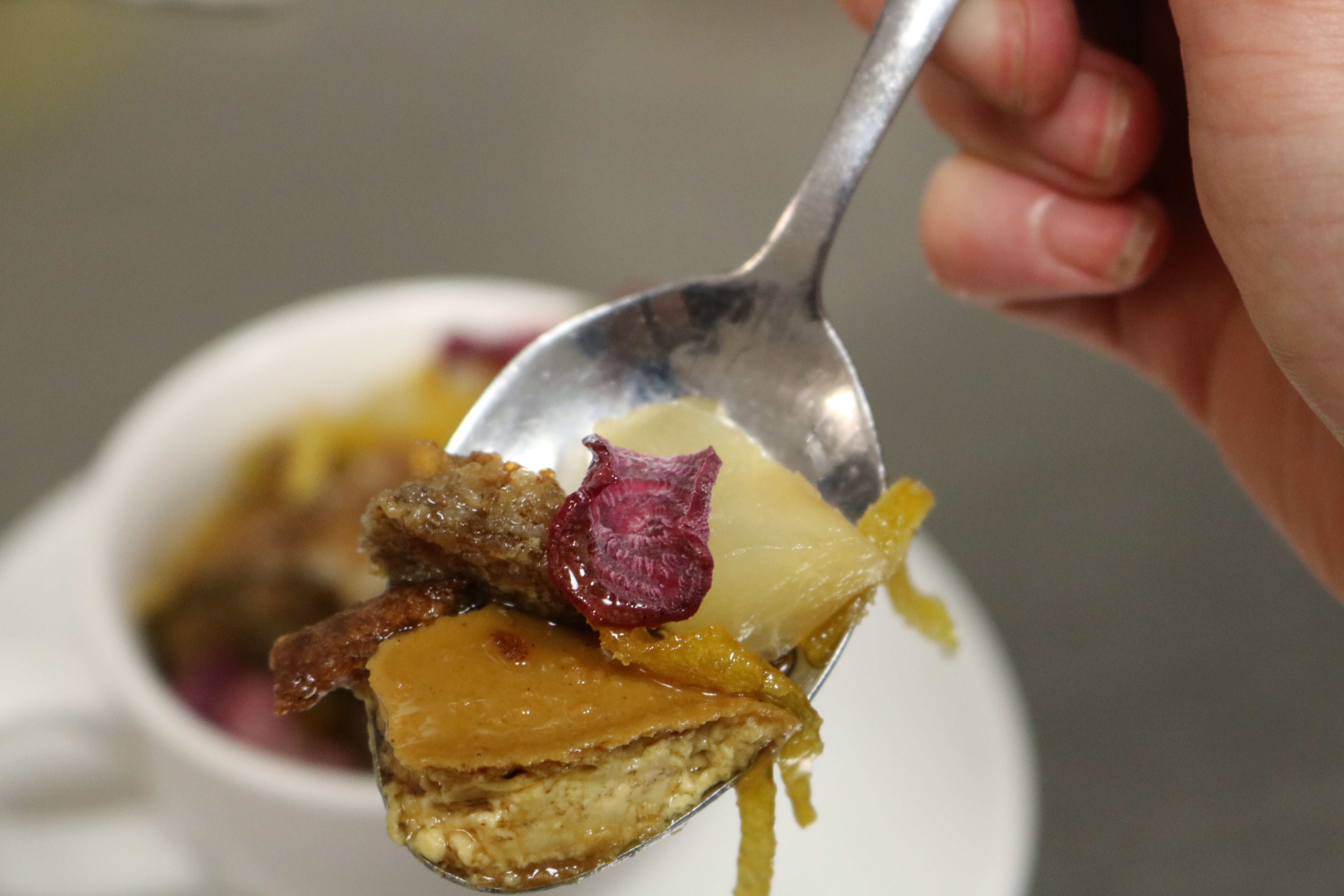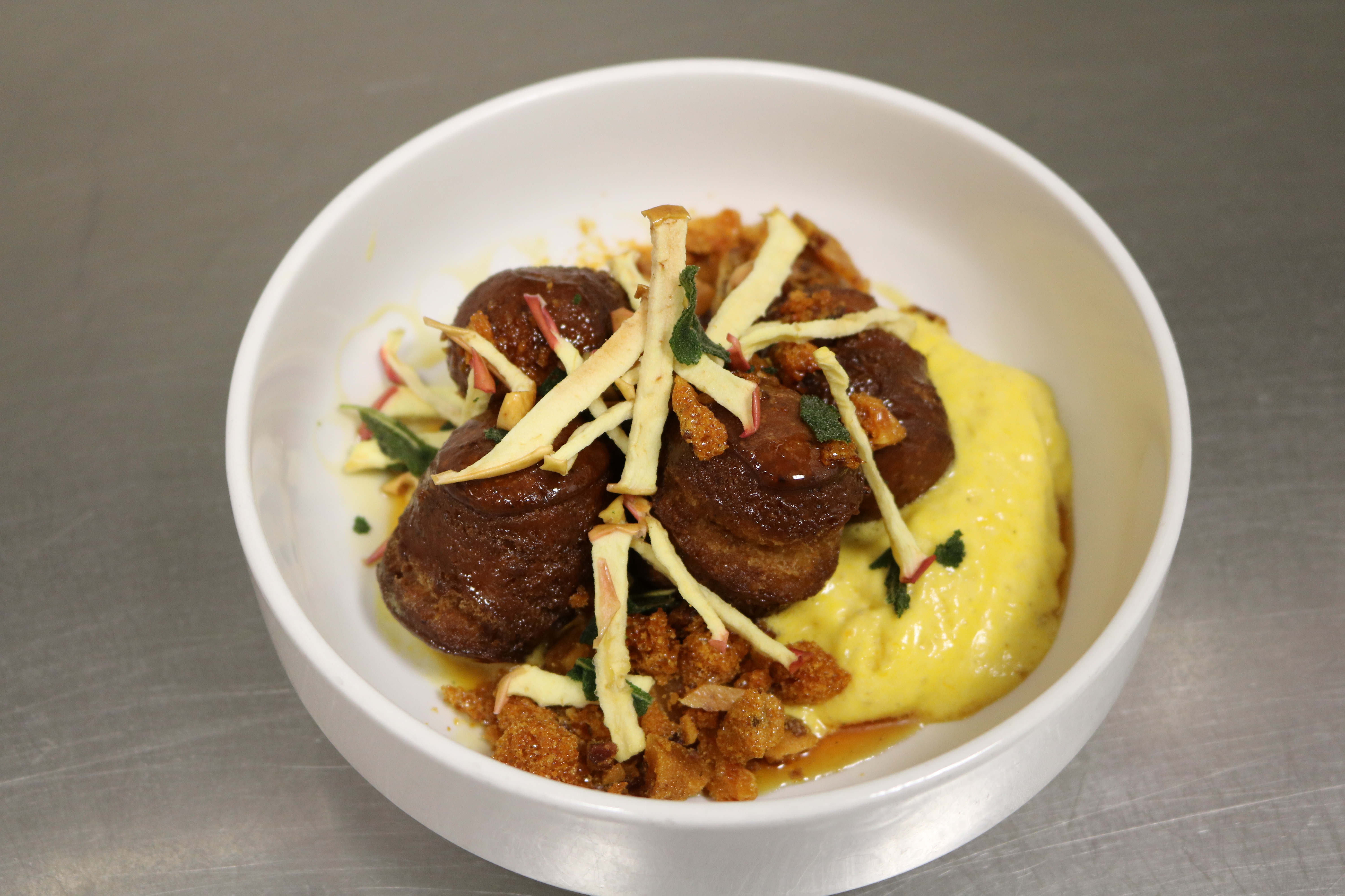 This dish is to remind you of fall at a Midwestern cider mill. Apple cider doughnuts tossed in a rum-maple glaze, squash mousse flavored with chai spices, bacon brittle, dried apple shoe strings with sage.