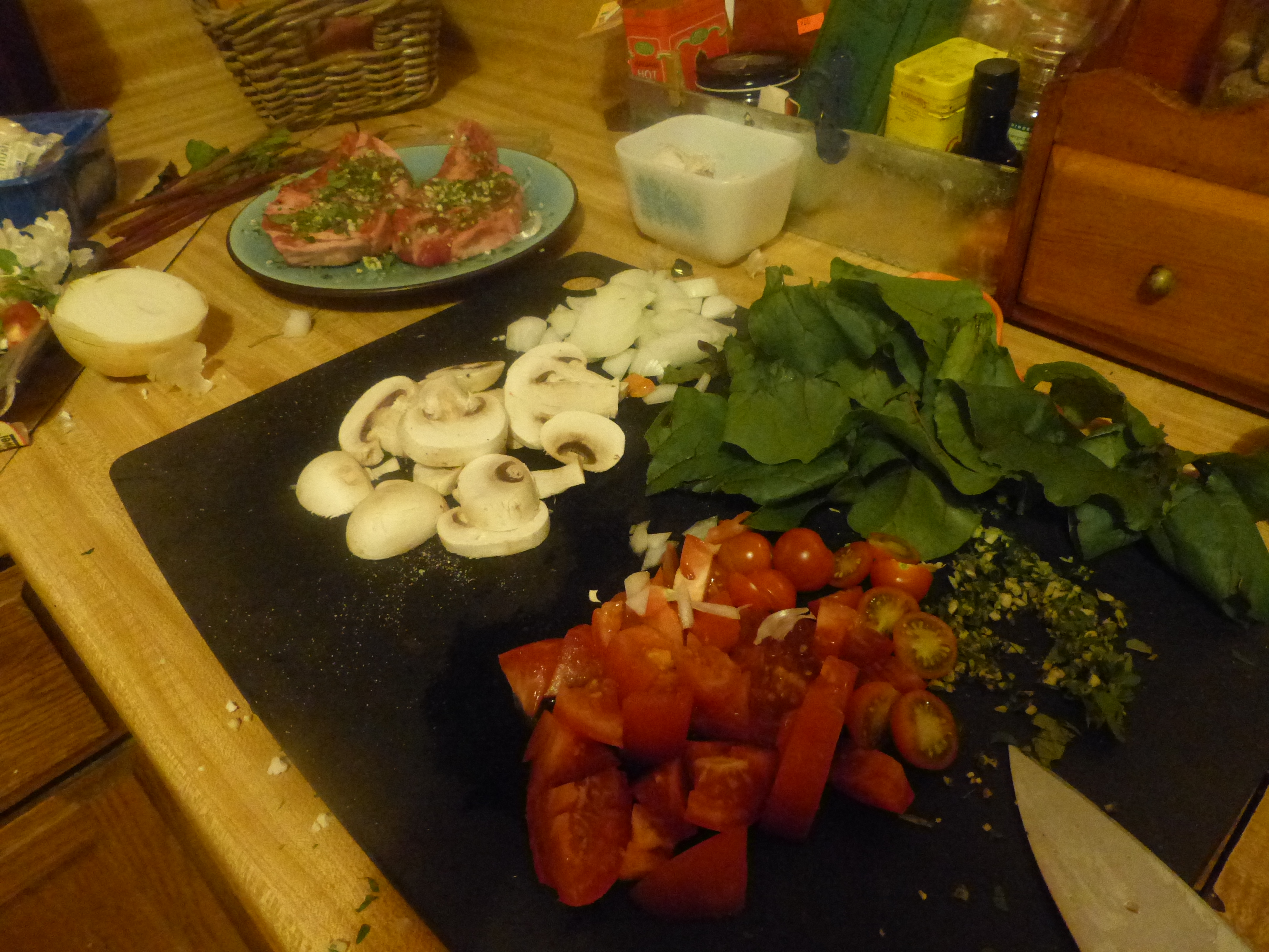 Dinner: a late night dinner that used many leftover ingredients in the fridge.  Arugula salad with strawberries (going bad, mind as well mince them up) with olives and crushed cashews, dressed in fresh lemon and olive oil.  Pan fried flounder (in the freezer, wild caught from Aldi) topped with a sauce made from onion, cumin, tomatoes, mushrooms, and coconut cream.